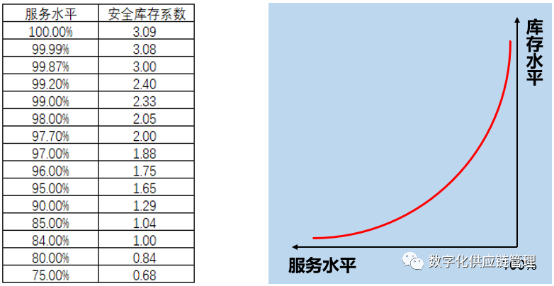左边的是安全库存系数,代表着当我们想要得到某个服务水平时,所需对应设置的安全库存系数为多少。而右边则大致是一条服务水平与库存水平之间的关系,我们可以发现,当服务水平越高时,每提升1%的服务水平所需付出的库存代价越大,例如从95%的服务水平提升到100%,仅提升了5%的满足率,但安全库存系数从1.65增长到了3.09,增长近一倍,带来了巨大的库存成本。这也引出了一个管理概念,所有人都在强调缺货的风险,但却没人知道要达到不缺货所要付出的成本,这是一个值得深入探讨的问题,我们在此处暂时不展开。