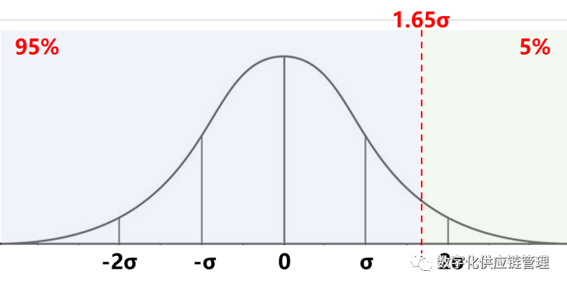 这里我们以较为常用的1.65为例,当z值取值为1.65时,相当于将库存水平设置在了1.65倍σ的位置(虚线),而接下来,新来的需求如果同样符合该正态分布,那么这个需求小于1.65σ的概率就等于95%,换句话说,有95%的需求可以得到满足,这也就是为什么说1.65对应的是95%的服务水平!